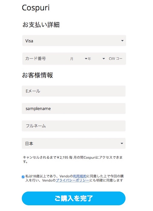 コースを選んでカード情報、メールアドレス入力の画面に進みます。